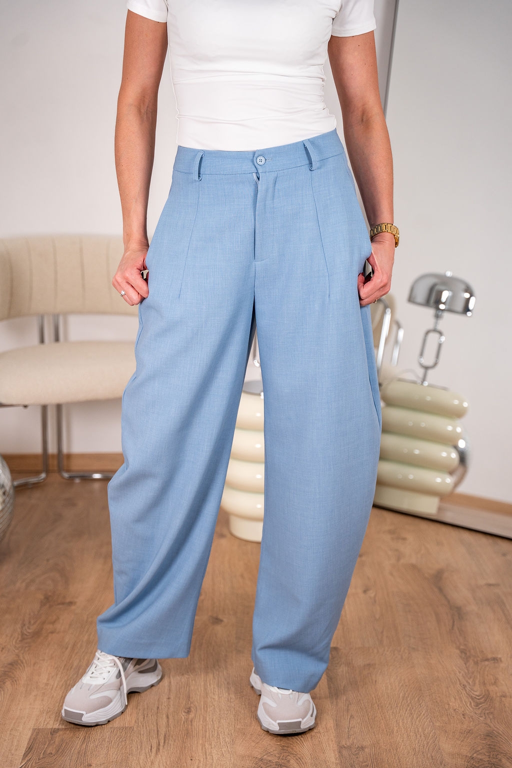Taille mi-haute dotée de passants de ceinture, d'une fermeture à bouton ton sur ton et de pinces avant profondes accentuant le volume des jambes. Finitions soignées avec poches latérales discrètes et poches arrière à rabat pour une silhouette tailoring moderne et décontractée