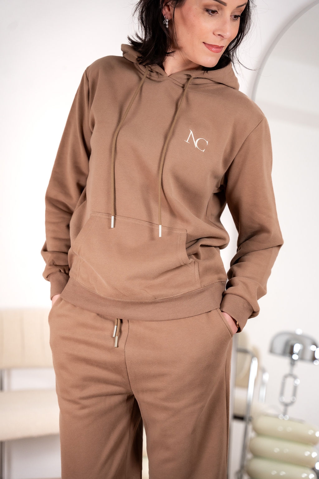 Ensemble avec capuche et poche kangourou, cordon de serrage. Logo brodé. Doublure chaude et douce sur l'envers. Bas évasé en bas de jambe, élastique et cordon à la taille.