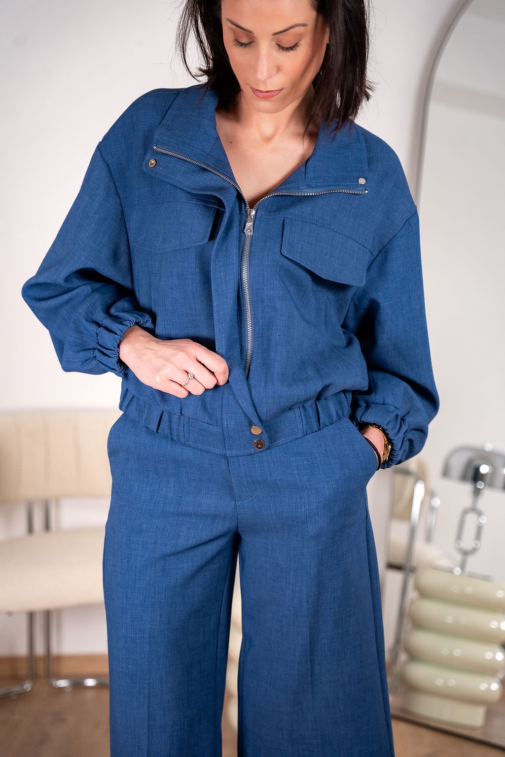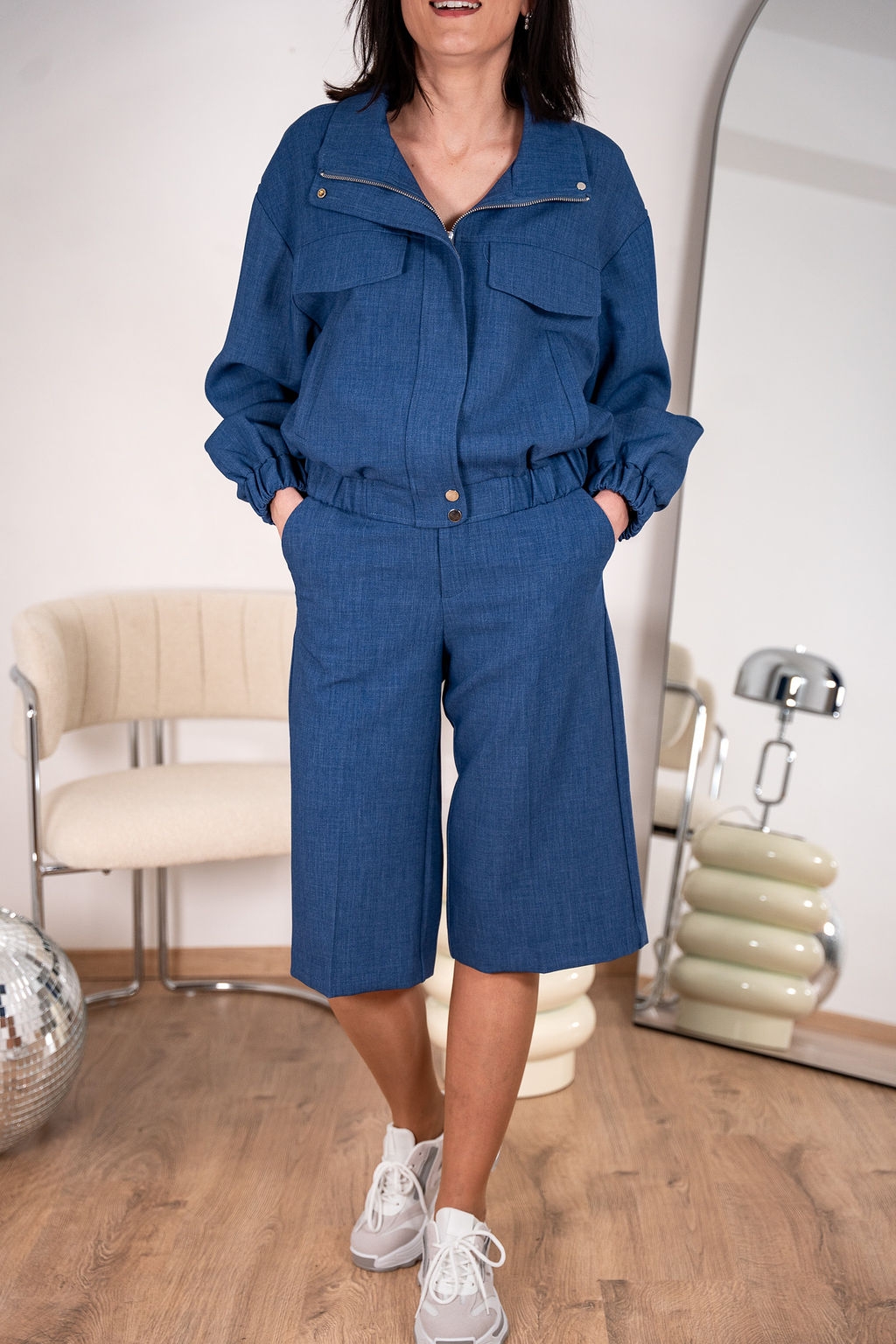 Le bermuda revisite le tailoring avec une coupe nette et élégante. Taille haute, pinces marquées sur le devant et longueur au-dessus du genou pour une silhouette moderne et équilibrée. Confectionné dans une matière fluide, il offre un tombé impeccable et un confort optimal. À porter aussi bien avec un top ajusté qu’avec une veste coordonnée pour un look chic et contemporain.